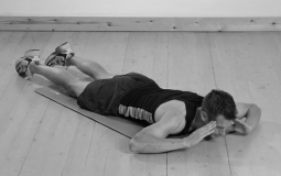 Lehněte si na břicho. Dejte ruce k hlavě a současně hmitejte směrem nahoru, zvedejte přitom ramena i nohy najednou.